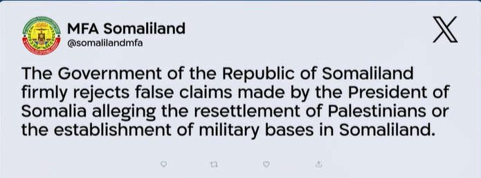 “The Government of the Republic of Somaliland firmly rejects false claims made by the President of Somalia alleging the resettlement of Palestinians or the establishment of military bases in Somaliland,” the Somaliland Foreign Ministry said in an official statement posted on X, formerly Twitter.